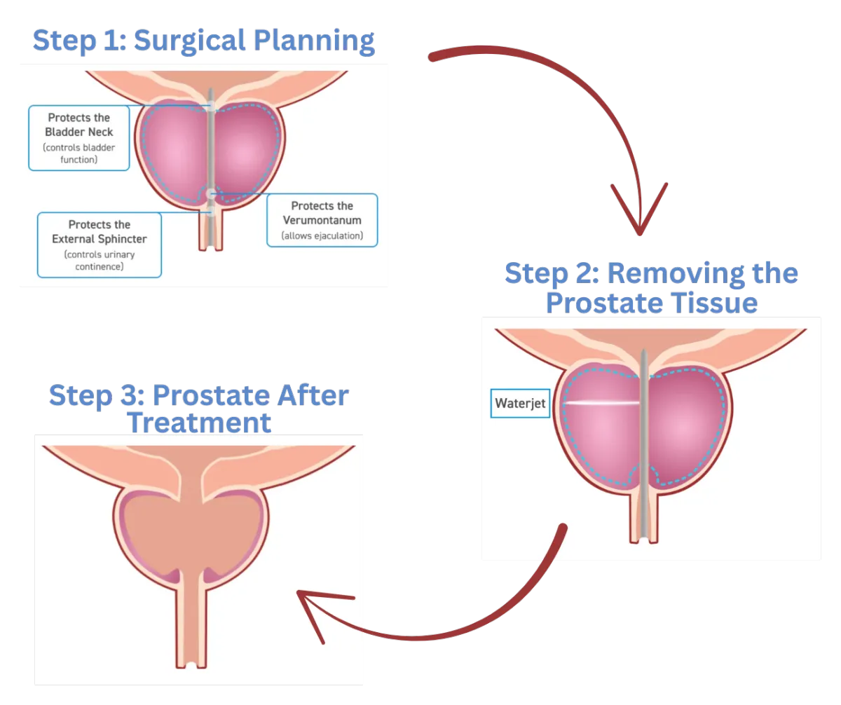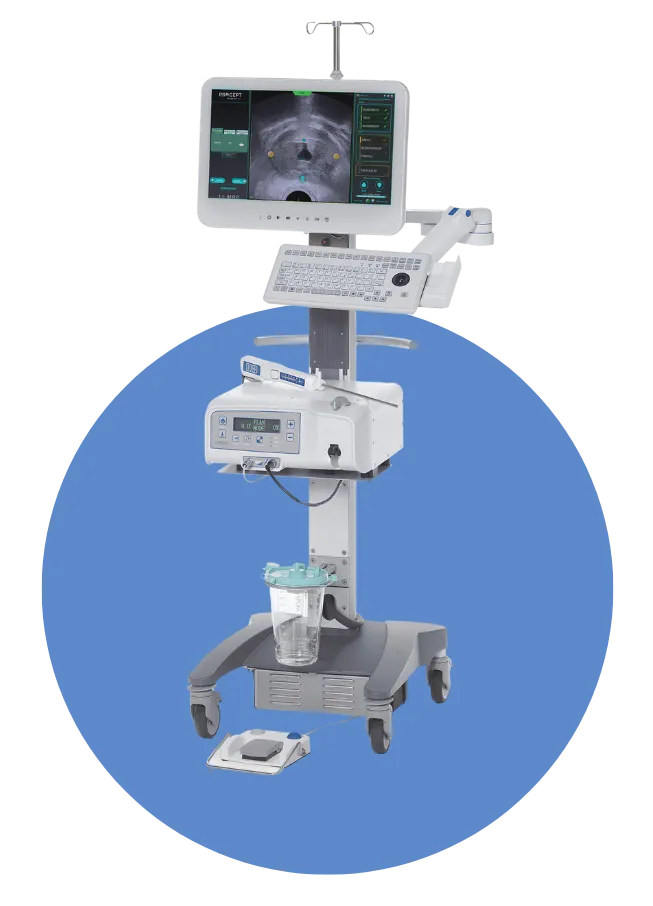 Next, a robotic-assisted system follows the surgical plan and resects the targeted prostate tissue using a heat-free waterjet. This advanced technology helps ensure precise, consistent, and predictable removal of the tissue.