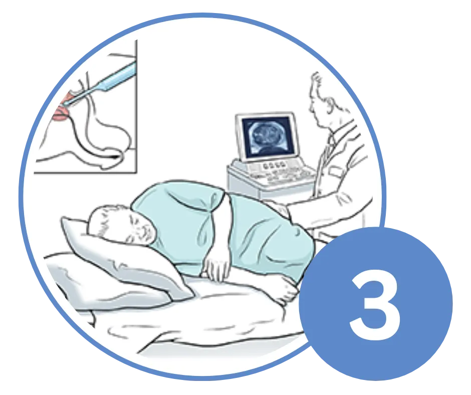 After the cystoscopy, the same physician will perform a transrectal ultrasound to capture images of the prostate gland and surrounding tissue.